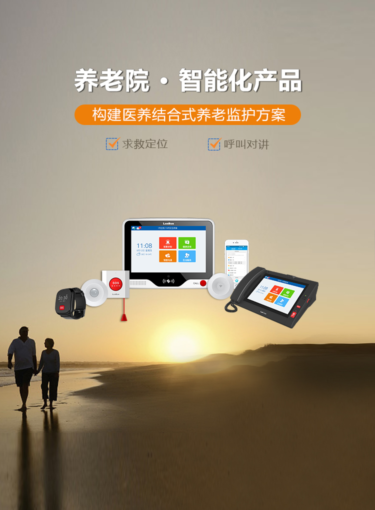 整合养老五大功能模块,含求救定位、环境监测、护理对讲、情感沟通、访客对讲,为养老院和社区居家场所提供智能一体化解决方案。