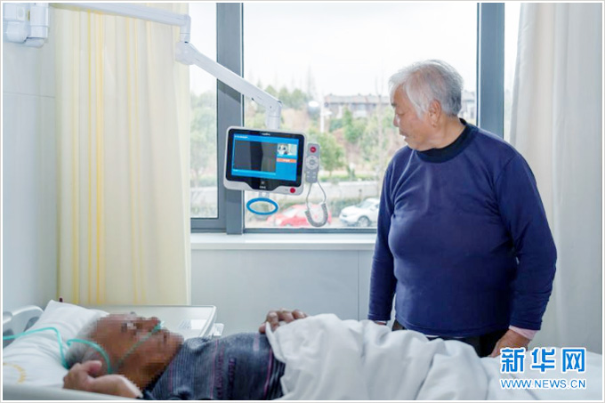 该院通过互联网技术远程与上海中山医院、浙江嘉善医院、江苏吴江医院以及青浦区域内医疗机构对接,支持长三角生态绿色一体化发展示范区三地居民诊疗信息的互联互通、医保免备案异地结算等。在医院的智慧病房中,一名病患家属使用病床前的百乐博bIbo智能设备视频呼叫医护人员(图片摘自:新华社记者摄影)。