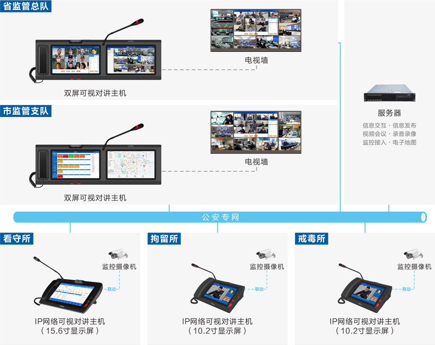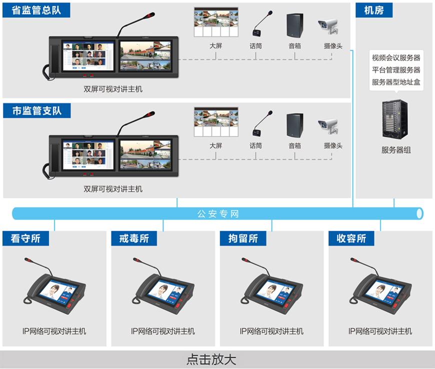 公安监管视频会议指挥系统 基于IP网络架构(可跨网段跨路由),以高清音视频编解码技术为核心,构建了一套功能完善、扩展性强、实时性高的联网式音视频实时交互平台。实现省监管总队、市监管支队、所指挥中心之间的实时沟通、视频会议、远程督察等用途。