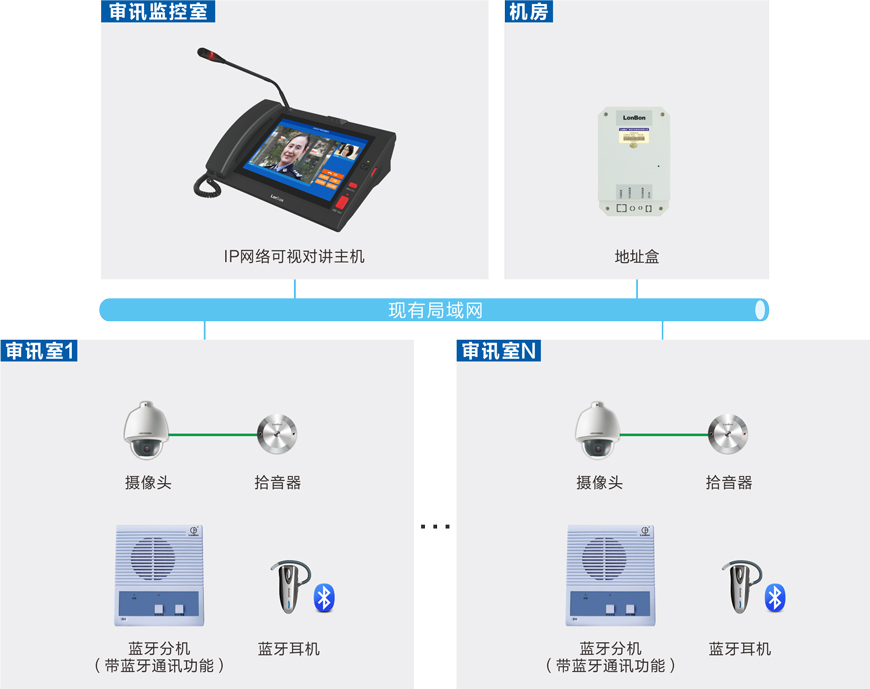 审讯室对讲系统 基于IP网络音视频及蓝牙通讯技术,实现审讯过程中的监听监视、报警对讲、远程语音授令等功能。系统可与第三方信息系统对接,获取审讯状态信息,发布显示在审讯室门口机上。