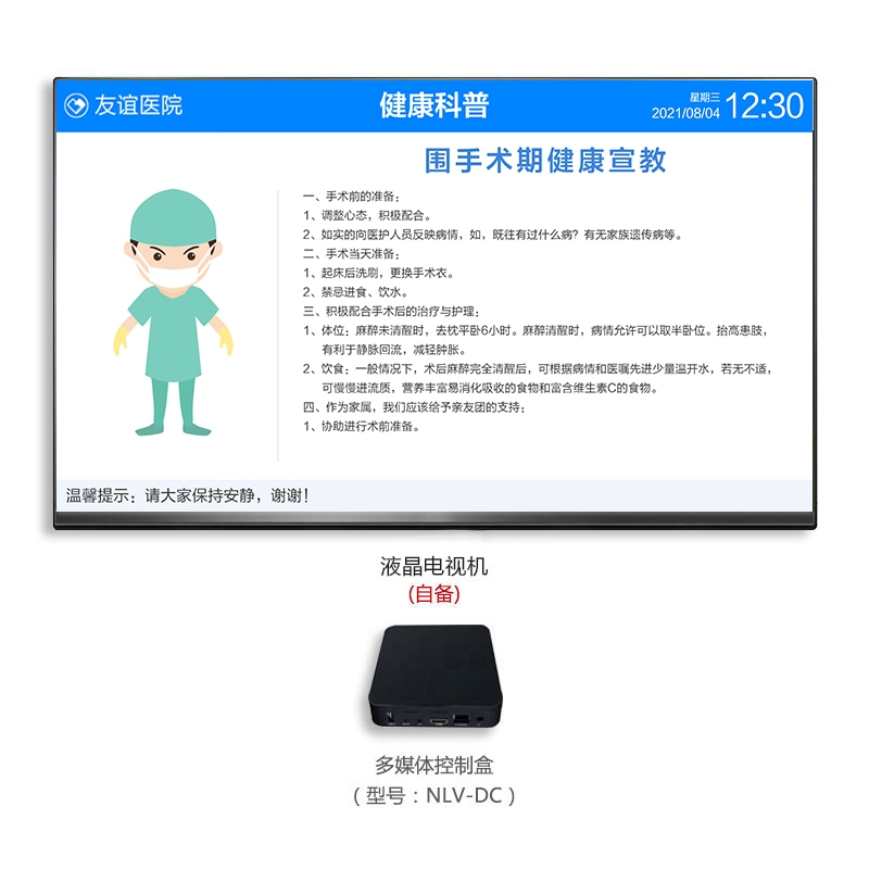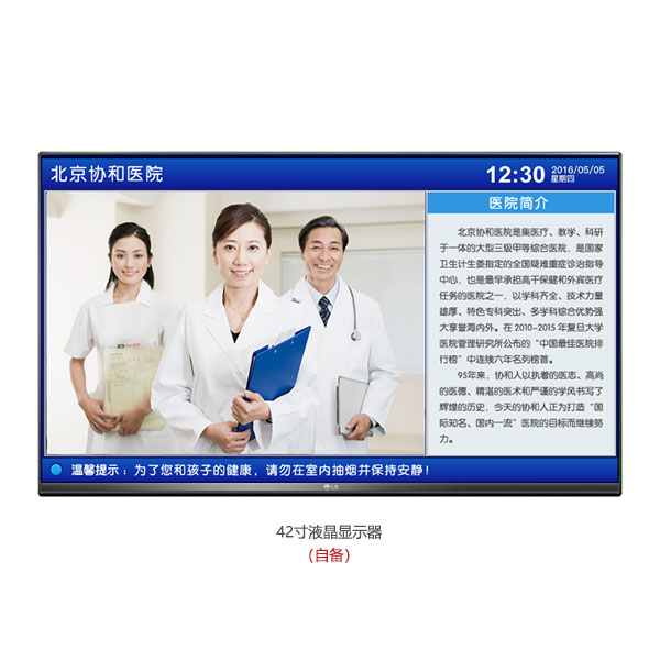 、液晶电视机(自备)组成。壁挂式安装在家属等候区。
