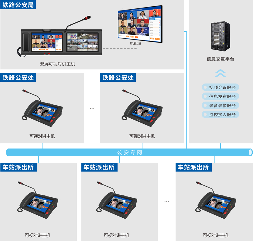铁路公安部门工作所涉及的范围越来越广,执法工作量日益增加,公众对铁路公安部门的工作效率、反应及应变能力等提出了更高的要求。同时,各机关之间地理跨度较远,日常勤务沟通较频繁,需建立一套“局--处--所”三级架构互联互通的“音视讯”通讯指挥系统,实现及时便捷的沟通交流,提升铁路公安局、铁路公安处、车站派出所之间日常沟通效率和应急处置能力。