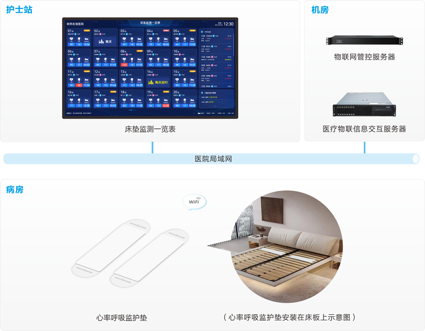 智能床垫监测系统 采用压电传感技术,基于WIFI无线传输,可对患者的心率、呼吸率及体动翻身、在离床等数据进行实时连续的采集、分析统计,并能实现床位监测、异常事件实时报警提醒。