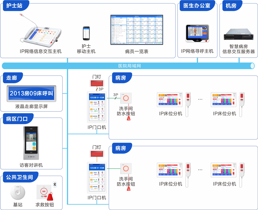 主要功能:呼叫护士、双工对讲、信息显示、呼叫解除、护理定位、信息发布。