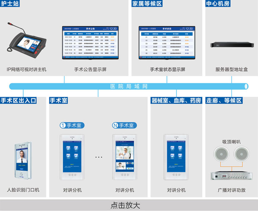 方便手术室内部与护士站或其它协同部门的视频通话,便于各部门之间的协调配合,为手术成功争取了时间。系统主要包含护士站主机、可视分机、手术状态显示屏等;系统基于局域网LAN和广域网WAN传输(可跨网段跨路由)技术,专用于手术室与护士站之间、手术室与手术室之间,以及手术室其它区域之间的双工可视对讲、求助呼叫、一键报警、录音录像、公共广播等,并能同步实时公告手术情况。