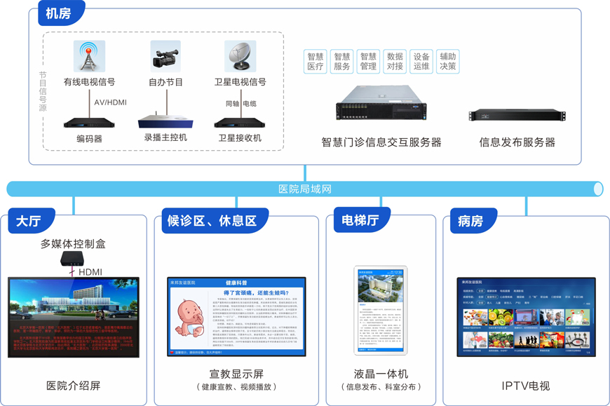 随着我国医疗建设的发展,营造良好的设施、幽雅的就医环境、提供优质的医疗服务已成为医院运营必不可少的手段。建立一套信息发布系统能够显著提升医院视觉环境,为患者就诊提供清晰明确的导引信息。