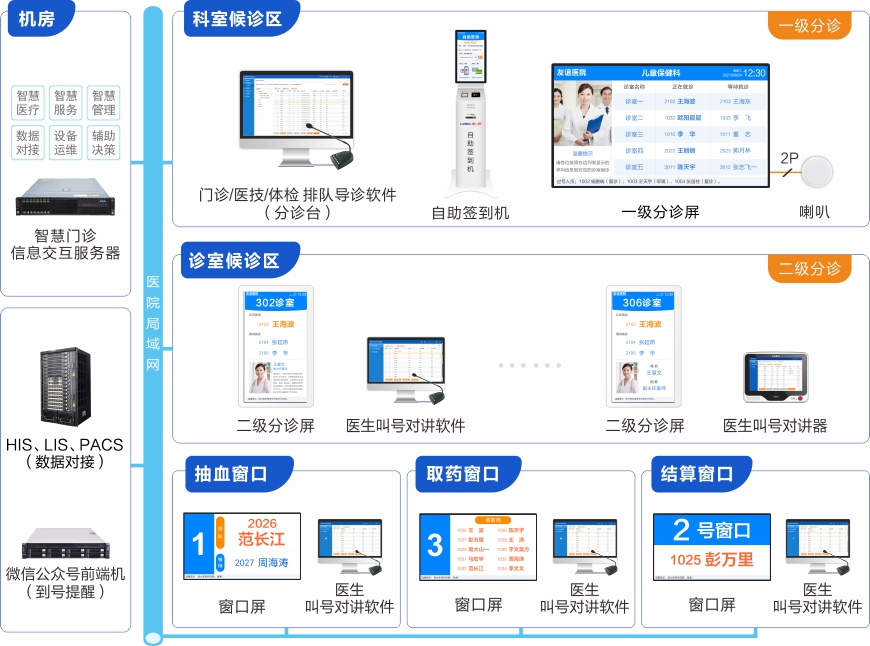 系统基于B/S及C/S相结合的系统架构,主要应用于医院门诊部、医技部、检验科、药房,解决患者就诊流程无序、就医环境嘈杂等问题,帮助护士智能分流、引导患者有序就诊。